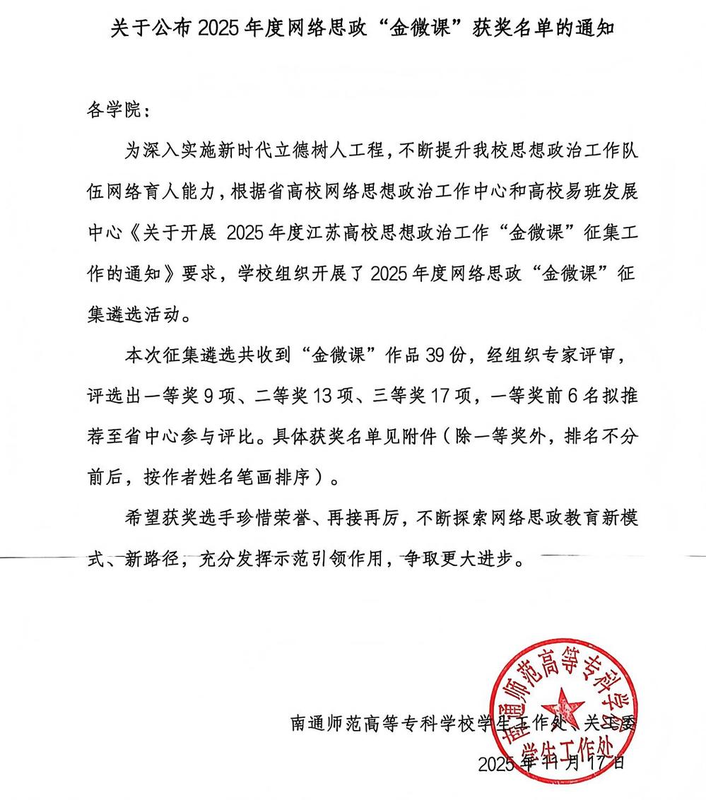 关于公布2025年度网络思政“金微课”获奖名单的通知