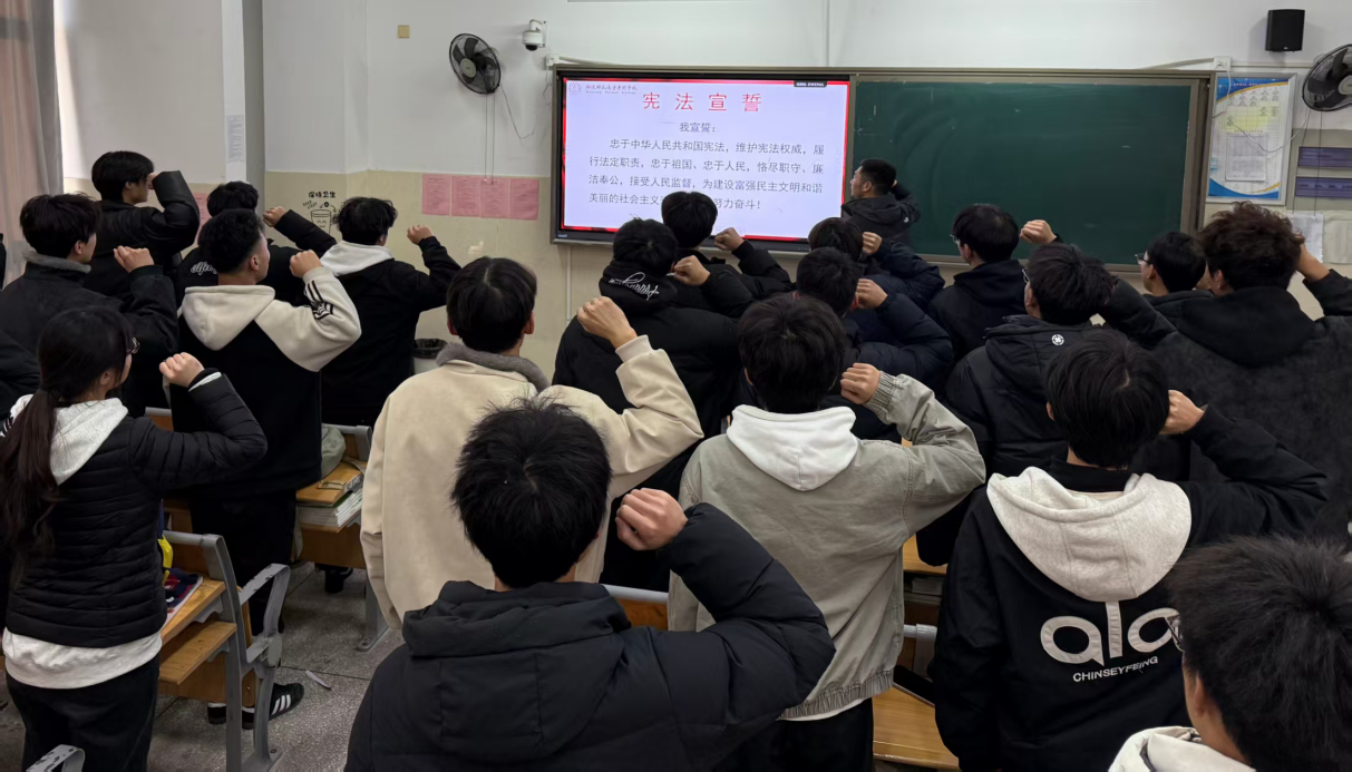 各班辅导员紧扣国家宪法日主题,通过研读宪法条文、剖析典型案例、观看宪法宣传片等形式,系统阐释了宪法的根本地位、核心作用与主要内容,引导学生深刻认识宪法与个人成长、社会发展的紧密联系。随后,在辅导员带领下,全体同学肃然起立,高举右拳,齐声诵读宪法誓词。铿锵有力的誓言在教室回荡,生动展现了新时代青年对宪法的真诚信仰,以及自觉践行法治精神、坚定维护宪法权威的使命担当。
