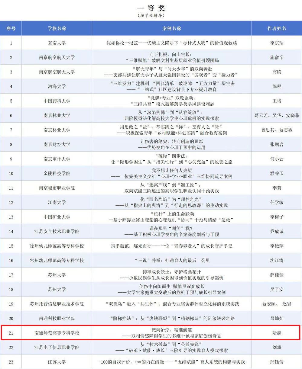 近日,2025年江苏省高等教育学会辅导员工作研究委员会辅导员工作案例遴选结果正式公布。经学校推荐、形式审查、专家评审,我校学工处思政科科长、管理学院辅导员陆超老师的工作案例《靶向治疗、精准滴灌——双相情感障碍学生的多维干预与家庭创伤修复》在全省高校辅导员百余篇参评案例中脱颖而出,荣获一等奖,展现出扎实的育人实践功底和专业的案例研判、撰写能力。